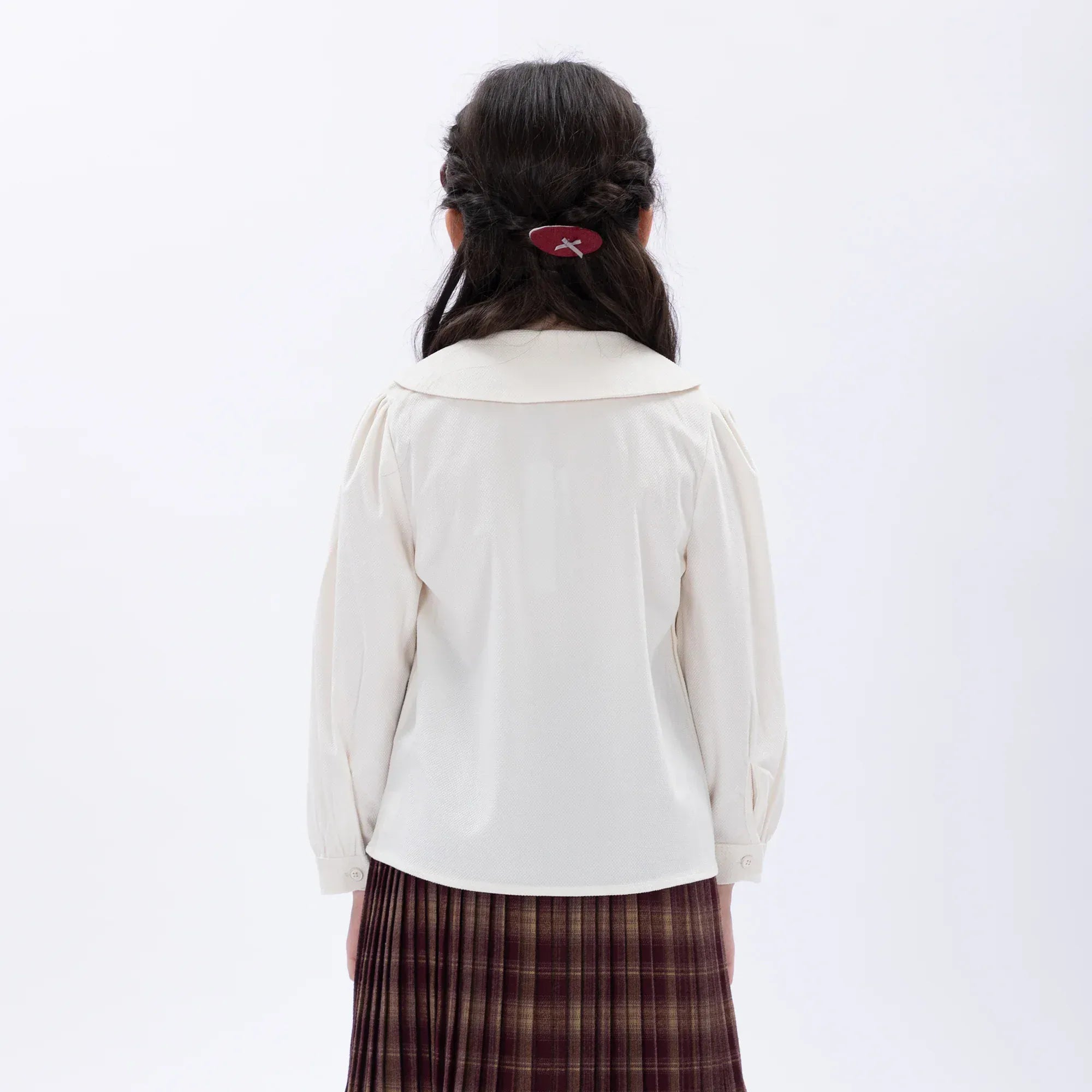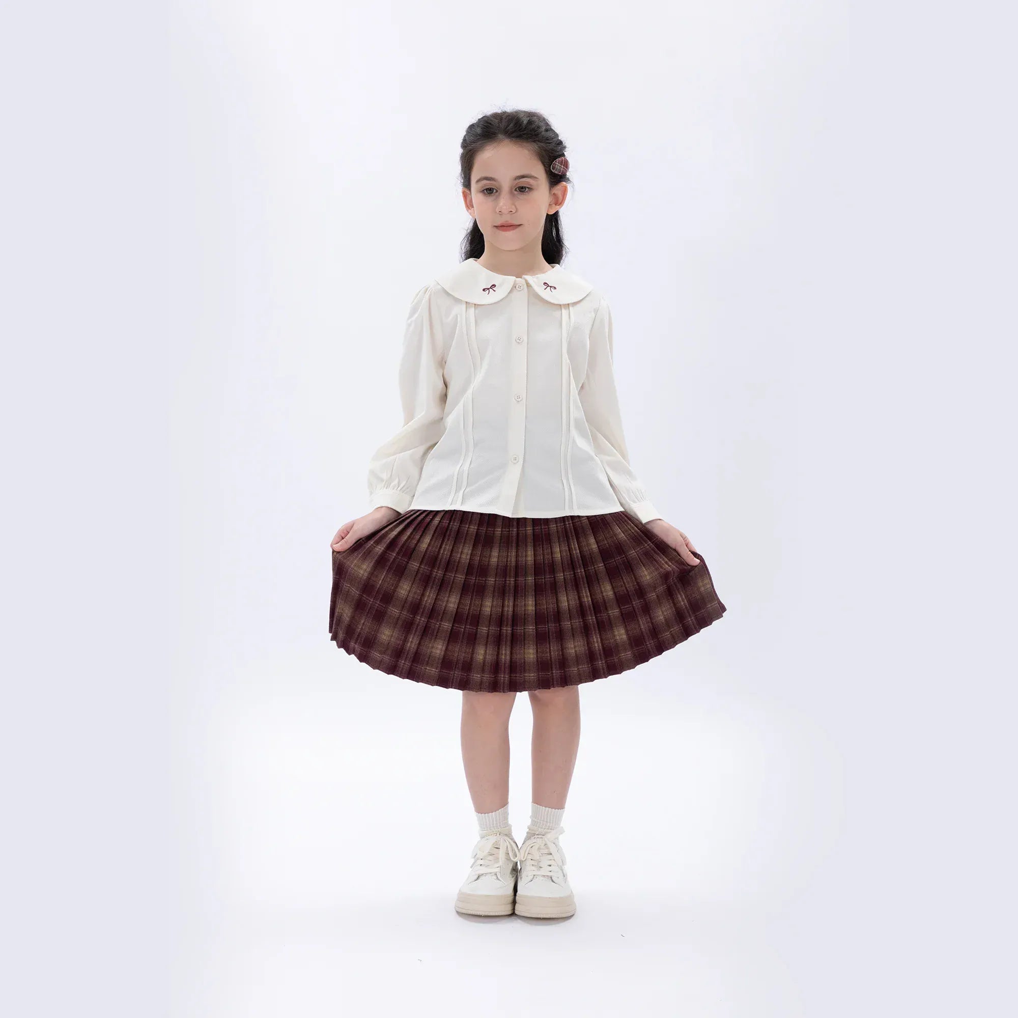 - Model Stats: Chest 57 cm, Waist 54 cm, Hips 66 cm, Height 124 cm, Weight 25 kg