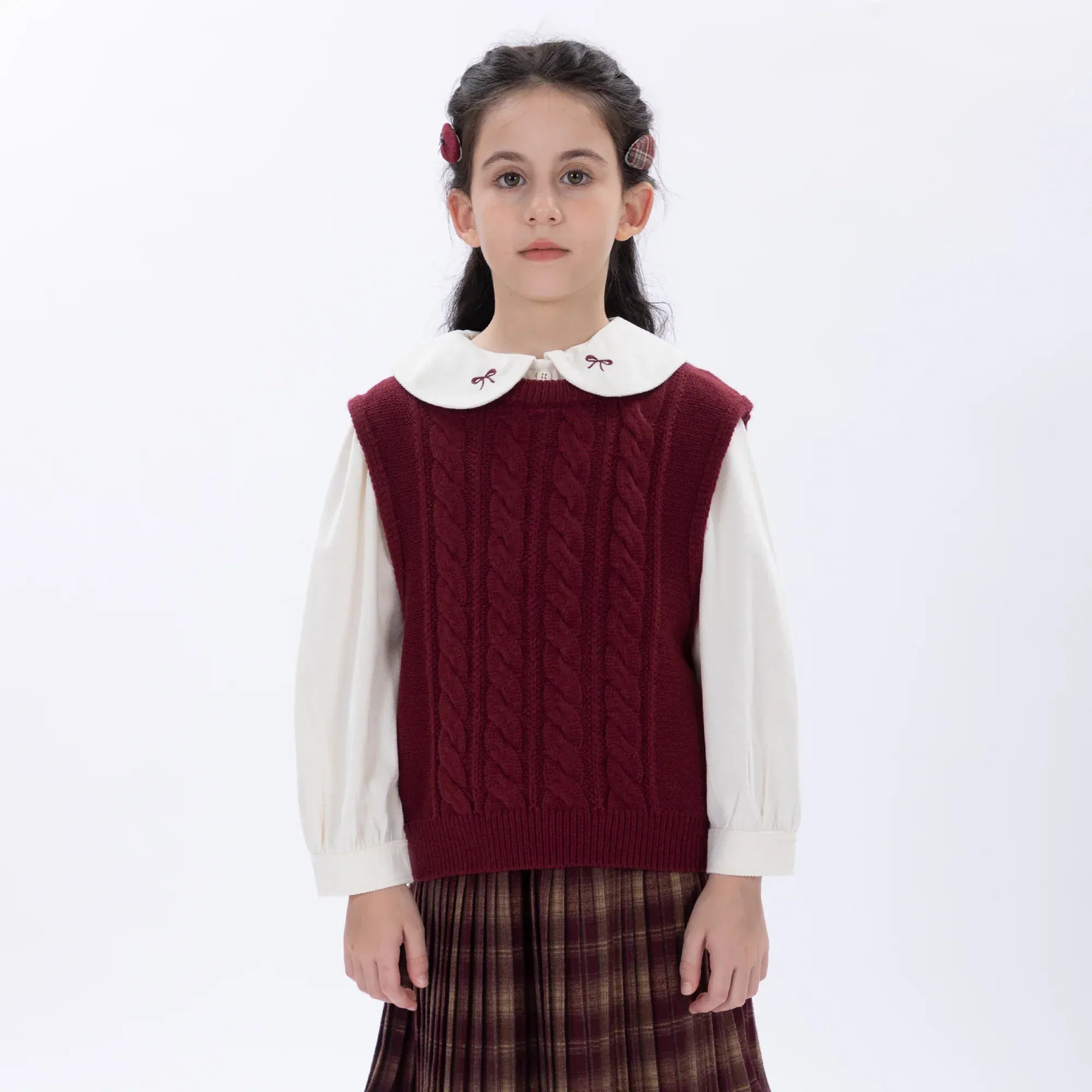 - Model Stats: Chest 57 cm, Waist 54 cm, Hips 66 cm, Height 124 cm, Weight 25 kg