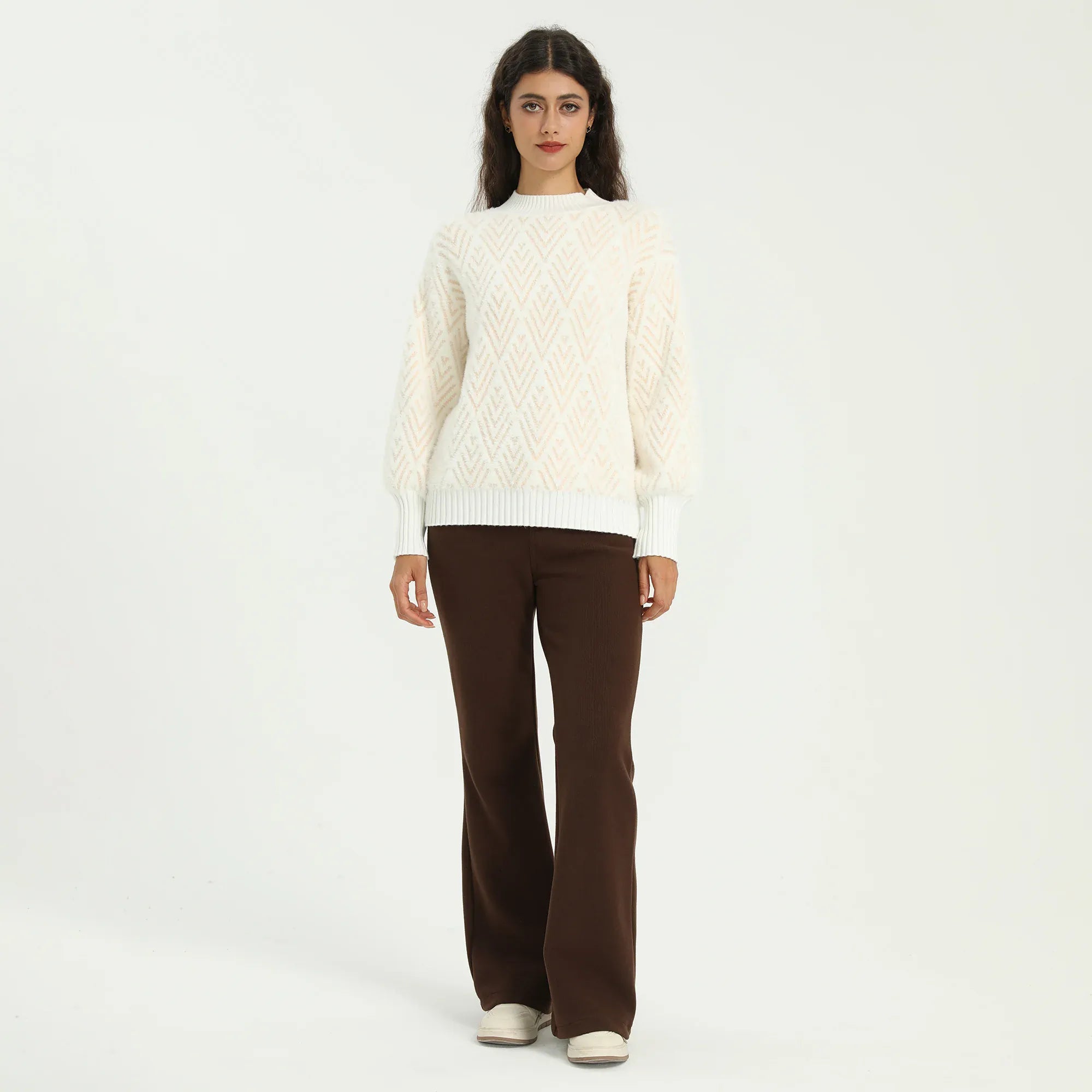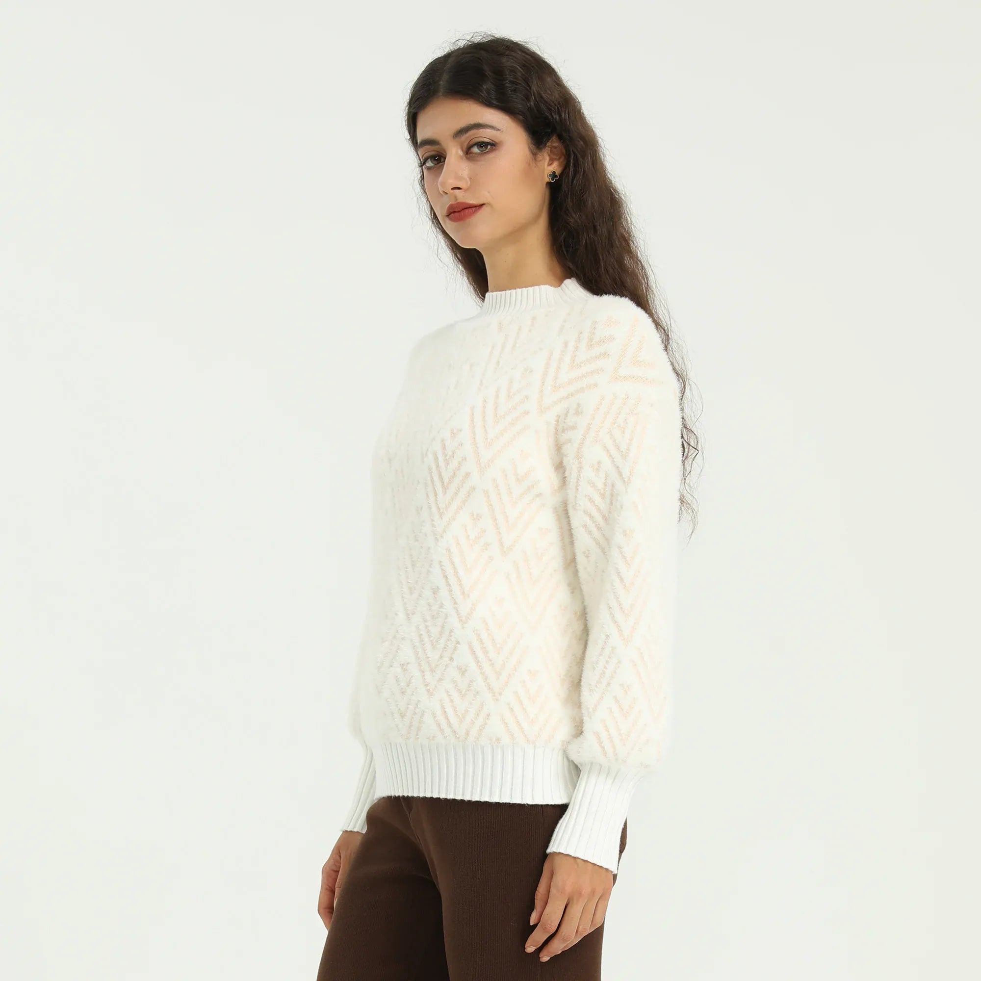 Product Description Length Sleeve: Long Sleeve Neck Fit: Tight Top Fit: Loose Type Sleeve: Drop-Shoulder Sleeves Pattern: Jacquard Fabric: Core Spun Yarn+Imitated Mink Yarn Model Wears: M Model Stats: Chest...