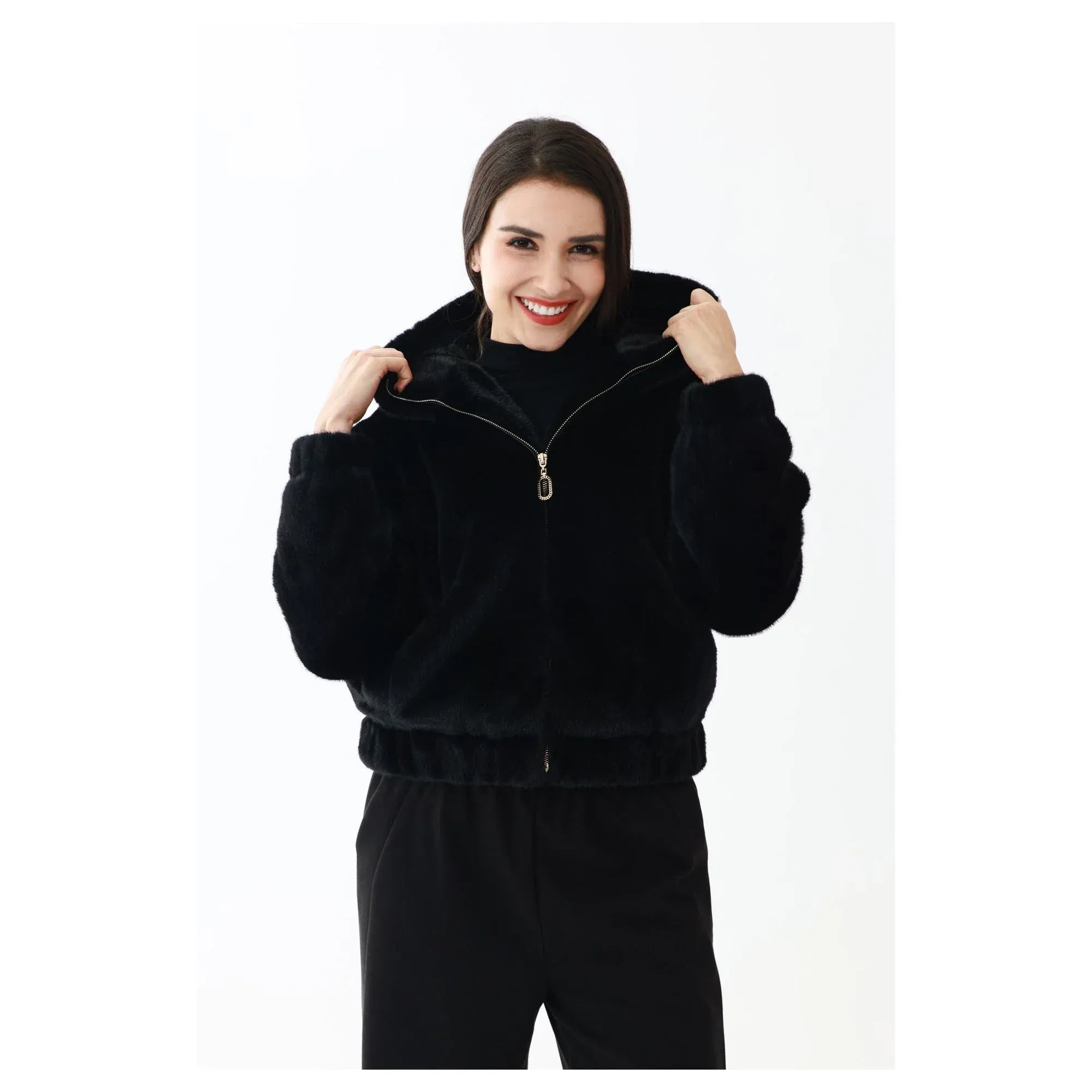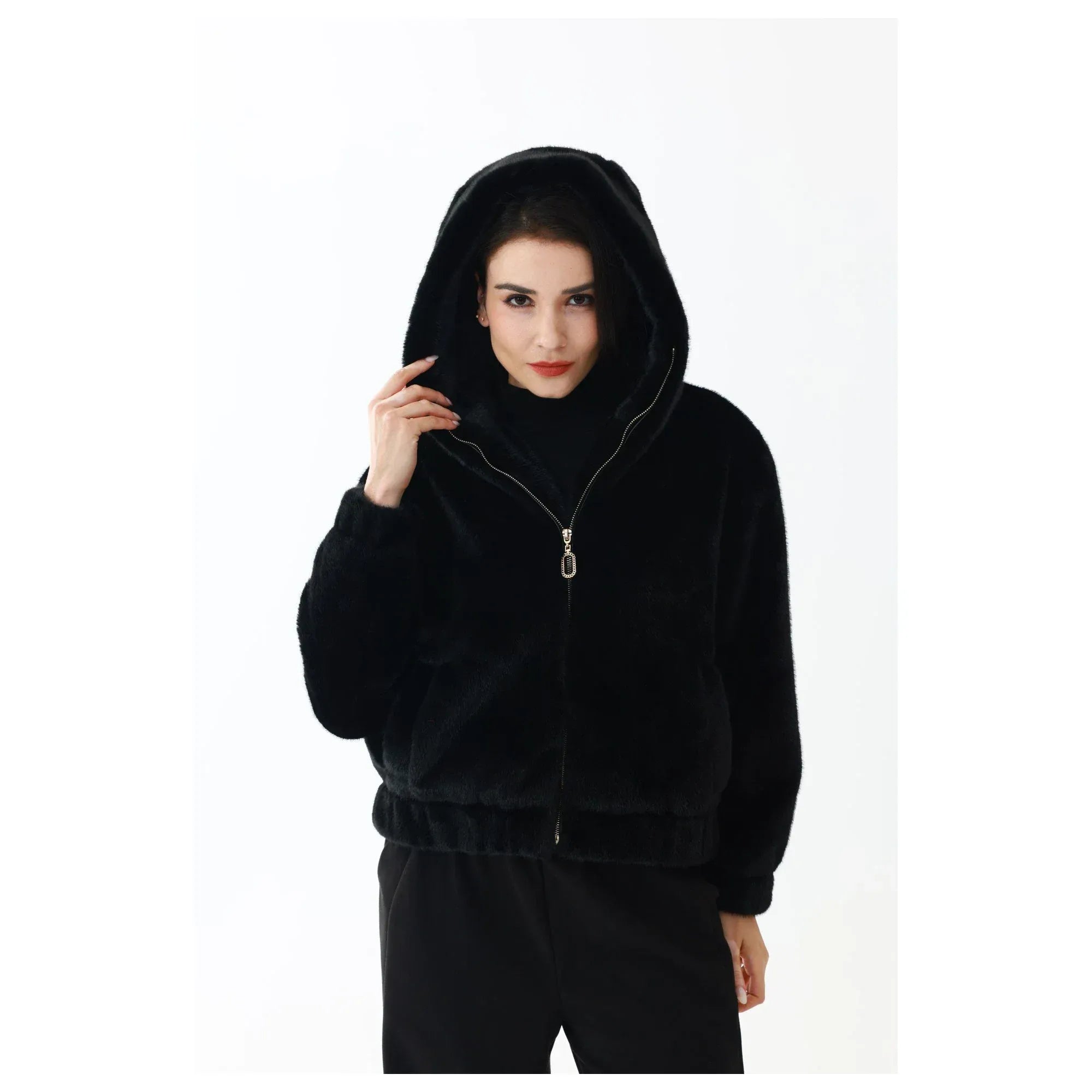 جاكيت فرو بغطاء رأس وسحاب إغلاق للنساء