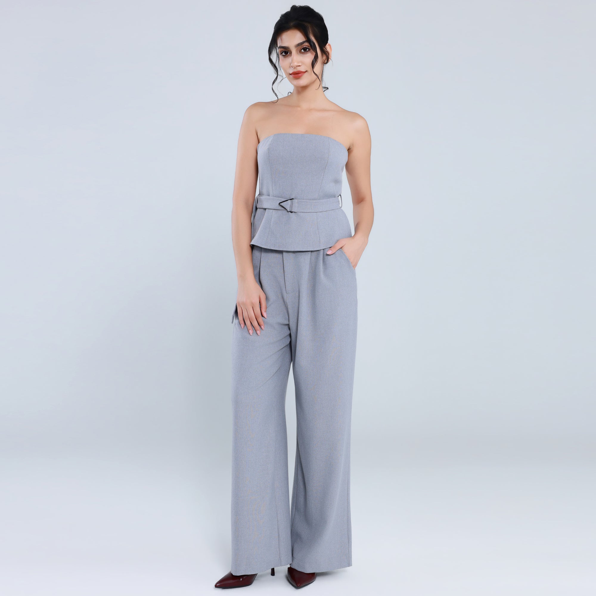 تفاصيل المنتج الجزء السفلي: قصة واسعة الخصر: خصر متوسط الطول من الأعلى للأسفل: 100% النمط: ساده الخامة قماش بخيوط مصبوغة يضمن ألوانًا ثابتة ومظهرًا أنيقًا تويل متين وناعم لمظهر أنيق...